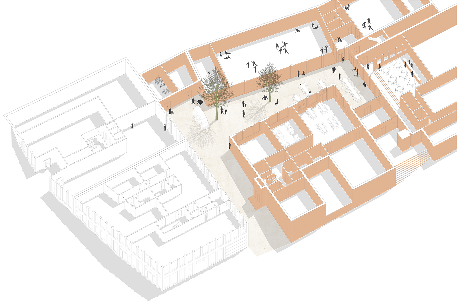 La proposition illustre une volonté de construire une réflexion par le vide, en s’attachant à la qualité des espaces extérieurs publics et semi publics ouverts et perméables : esplanade, rues, ruelles, place, placettes...